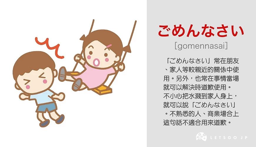 | ごめんなさい | gomennasai | 對不起 (朋友家人間常使用) |