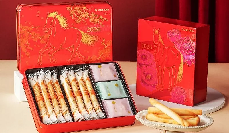 「YOKU MOKU」是日本定番的蛋捲伴手禮品牌,吃起來香脆美味,讓人停不下來,也是台灣第一名模林志玲的喜餅品牌呢!2026年趁著馬年春節推出了「迎春禮盒20入」馬年限定款,可以吃到品牌最經典的原味雪茄蛋捲之外、還有特別口味可可雙層白巧克力薄片,以及雙層楓糖牛奶巧克力餅乾一共20入,每一品項都以獨立密封包裝,馬年主題設計融入矢絣及龜甲之和風紋樣,象徵長壽安康與福運綿延,精美又兼具衛生,第一名非這款莫屬!