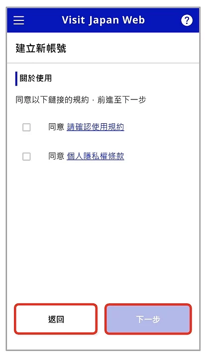 首次使用 Visit Japan Web 需要建立新帳號。進入 Visit Japan Web 網站點選「建立新帳號」(圖1-1)之後將跳至使用規約頁面(圖1-2),勾選請確認使用規約與個人隱私權條款後按「下一步」至輸入帳號資料頁面(圖1-3)。請輸入電郵地址並設定密碼,密碼需要10字元以上並且包含英文大小寫和數字與符號,例如「+ABcd1234+」,勾選「我是人類」後再按「建立帳號」鈕。