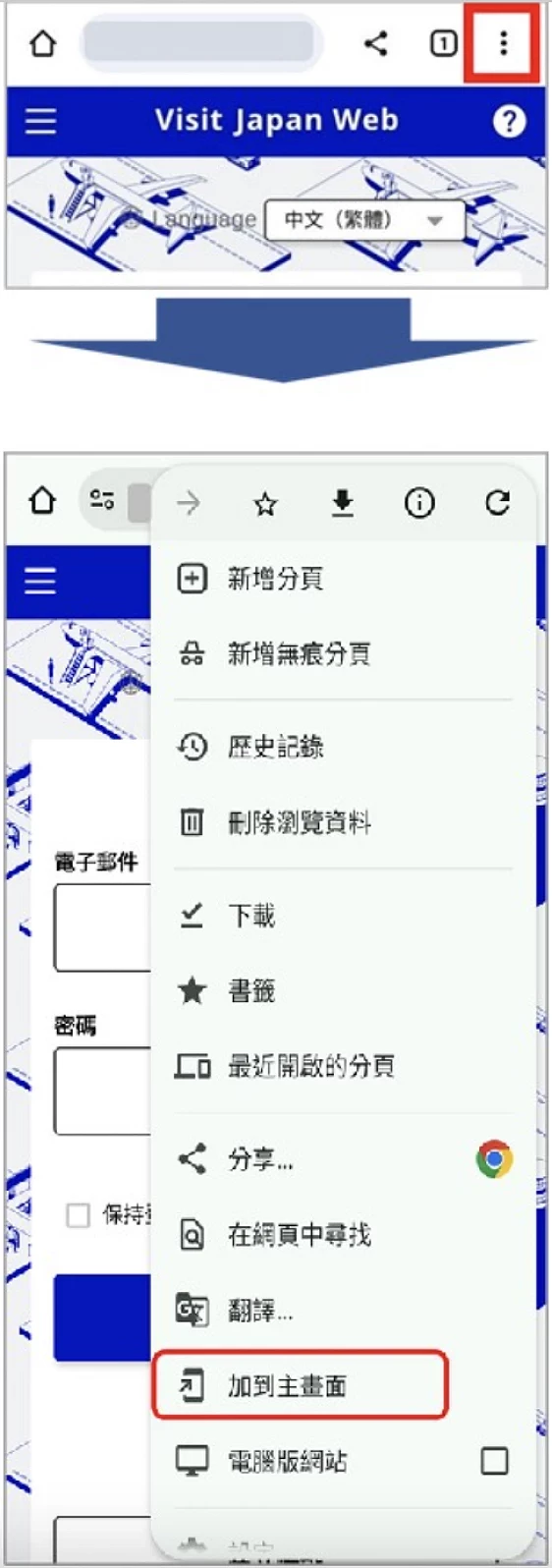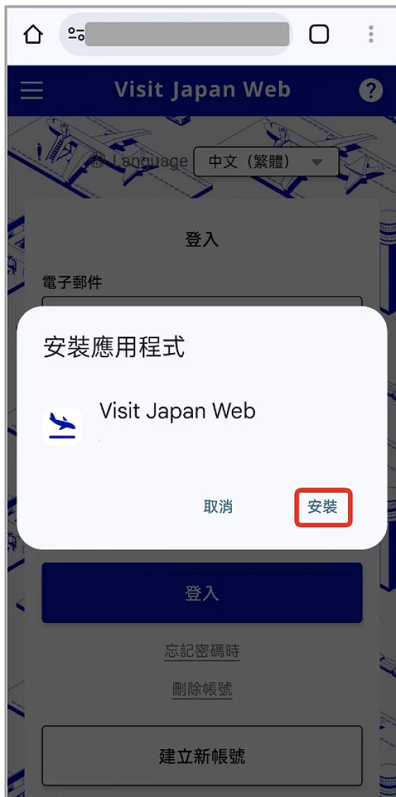 Android 用戶需要下載 Visit Japan Web「APP」時,需先以 Chrome 瀏覽器打開 Visit Japan Web 填寫網站,留意畫面下方出現的浮窗(圖10-1),點擊「將 Visit Japan Web 新增至主畫面」。如果畫面下方沒有出現浮窗,則可手動點選畫面右上角的三點(圖10-2),在彈出的選單中,點選「安裝應用程式」。當系統出現確認訊息(圖10-3)時,點選「安裝」即可。