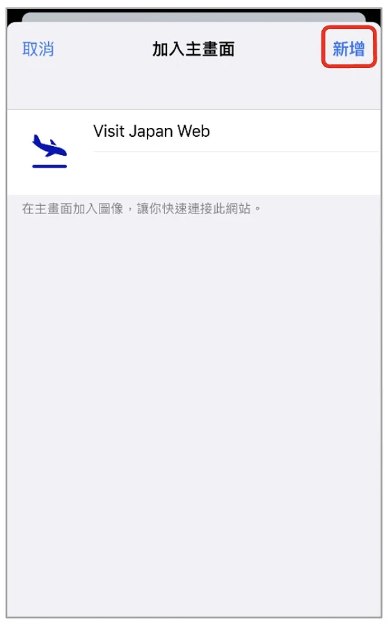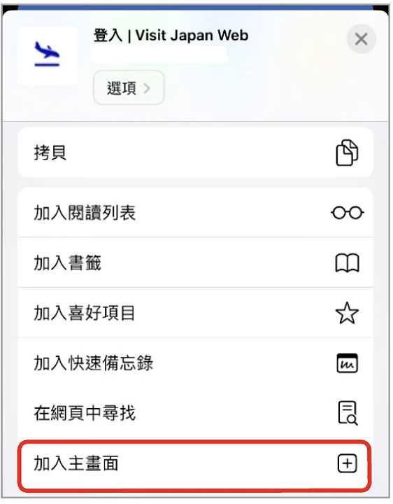 iPhone 用戶需要下載 Visit Japan Web「APP」時,需先以 Safari 瀏覽器打開 Visit Japan Web 填寫網站,留意畫面下方出現的浮窗(圖10-4),點擊被紅框標示的按鈕,在彈出的選單(圖10-5)中,點選「加入主畫面」。當系統出現確認訊息(圖10-6)時,點選「新增」即可。