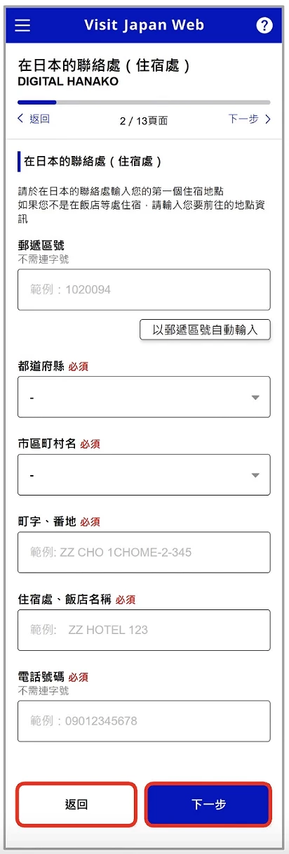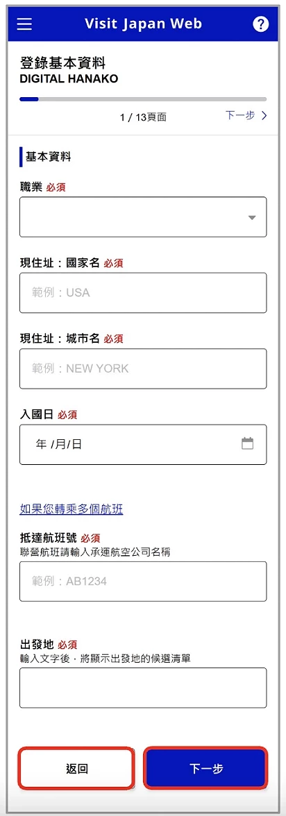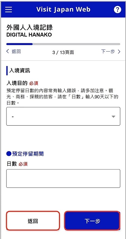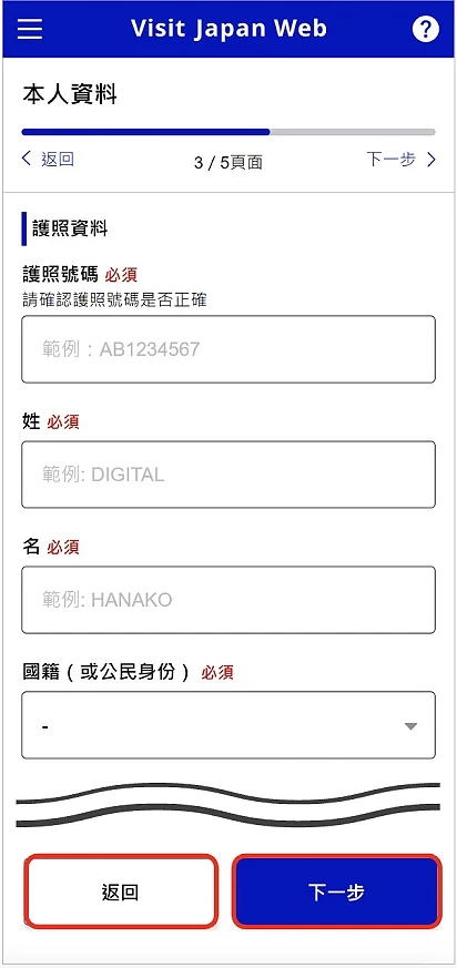 接下來,要進行入境審查及海關申報,在進入「入境審查及海關申報登錄」(圖6-1)頁面後,會彈出資訊框,告知大家使用電子版入境審查及海關申報時,不同關卡需要的不同資訊,閱讀後即可按返回,繼續填上自己的個人基本資料(圖6-2)、日本住宿地點的詳細資料(圖6-3)還有入境目的、逗留日數等等相關資料(圖6-4)。