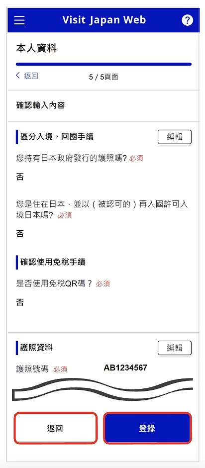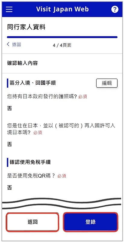 如果在日本有住址或使用頻繁的住宿處則可以填寫,如果每次入境都是住不同地方,建議在日本的聯絡處每一格都維持空白,直接按下「確認輸入內容」。請再次核對輸入的內容是否有錯誤(圖2-4),有的話可以按「編輯」進行調整,正確無誤請按「登錄」。最後回答是否持有入境日本的所需 VISA 的提問(一般來說台灣或香港人以短期觀光身份入境日本時並無須申請 VISA,此情況點選「否」即可。畫面會跳轉至 VISA 說明網頁,確認完畢後,點選「返回首頁」即可回到「首頁畫面」繼續下一步)。