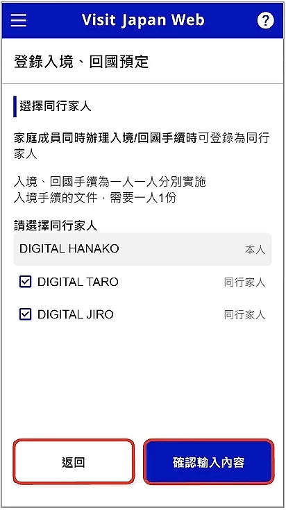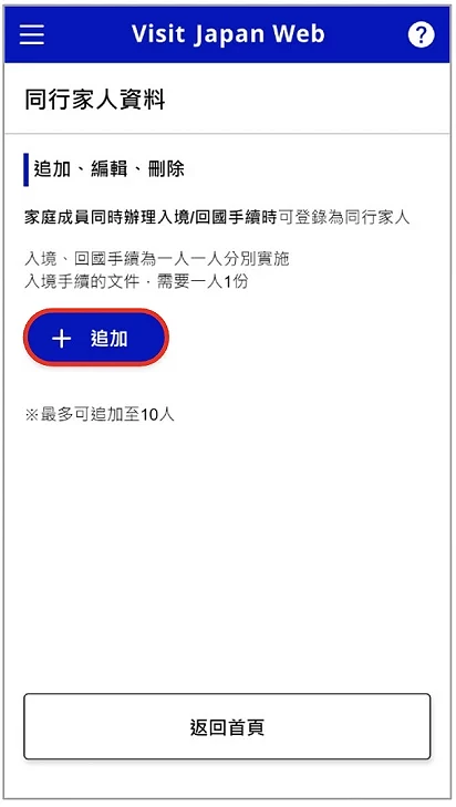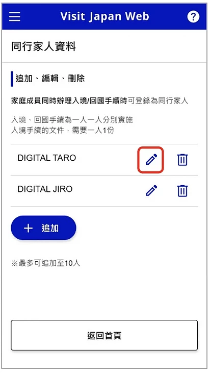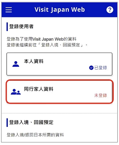 原則上 Visit Japan Web 是針對每人分別實施,但官方說明指南有指出如果同行的家屬中(家屬包括:配偶、直系長輩、直系後裔以及被承認具有同等地位的親屬)有嬰兒、幼童或無法自行辦理手續者,則可登錄為同行家人。登錄方法很簡單,在登錄完自己的資料後回到首頁,選擇「同行家人資料」(圖2-5),並按下「追加」(圖2-6),每人最多可登錄10位同行家人,入境手續的文件需要一人一份。輸入家人的區分入境、回國手續,以及護照資料後按「登錄」(圖2-7)。而後會同樣被要求確認是否持有所需 VISA,確認方法與上述做法一樣。如果需要修改家人資料,則再度回到首頁點選「同行家人資料」,並點選在家人名字旁的編輯圖示(圖2-8)以調整內容。需要注意的是,同行家人的所有成員都必須跟申請人一同行動,也就是說不管是入境或出境都必須結伴同行,如果是有機會分開行動的話,則不適用同行家人的功能。