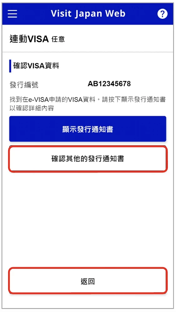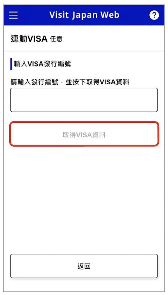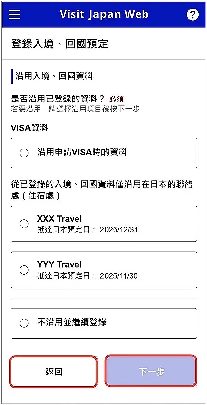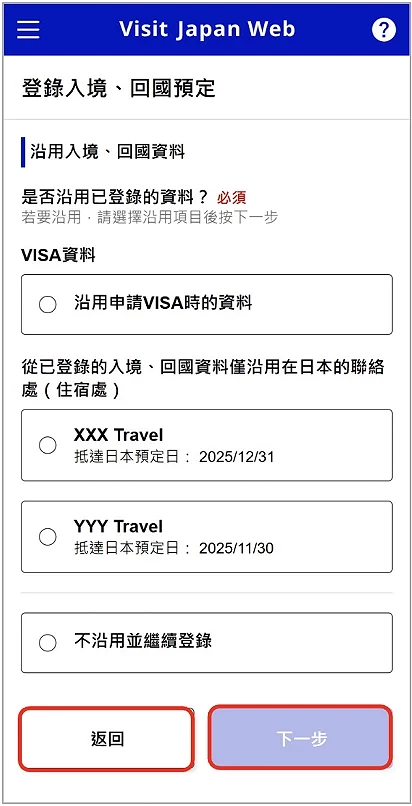 確認資料無誤之後,就可以繼續輸入其他簽證資料或點選「返回」(圖4-3)至下一項。※ 在「登錄入境、回國預定時」步驟時,若已從上次入境日本的記錄中點擇「沿用 VISA 資料」,此處會自動完成連動。注意,如手持紙本簽證,除了在網上連動,入境時還需要出示實體簽證。