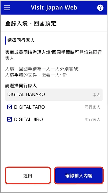 進入入境、回國預定的填寫畫面(圖3-3)後系統會要求你輸入行程的名稱,但並非必填,故想不到名目的話,可以跳過。注意將「抵達日本預定日」、「航空公司名稱」、「航班號」三個必填的訊息都填好就可以了。接著需要輸入在日本的聯絡處地址(預設值會顯示於步驟 2 登錄入境、回國預定中填寫的「在日本的聯絡處」)。最後,若有同行家人需要登錄,可以勾選該位的同行家人。(圖3-4)