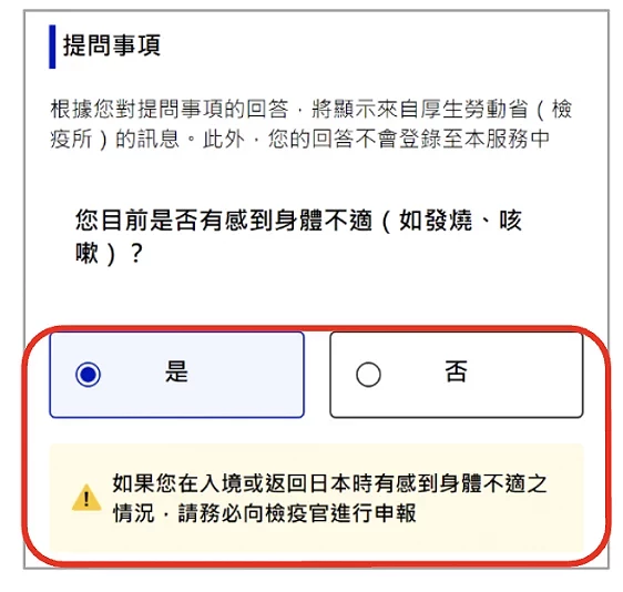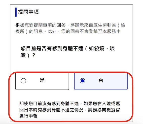 雖然現在不需出示相關疫苗接種證明,但需要就健康狀態作出聲明。首先進入「檢疫(確認健康狀況)畫面」(圖5-1),在「您目前是否有感到身體不適(如發燒、咳嗽)?」問題下,按身體狀況回答「否」(圖5-2)或「是」(圖5-3),如果是有感到身體不適的話,除了如實回答外,亦請記得入境時要向檢疫官申報喔。