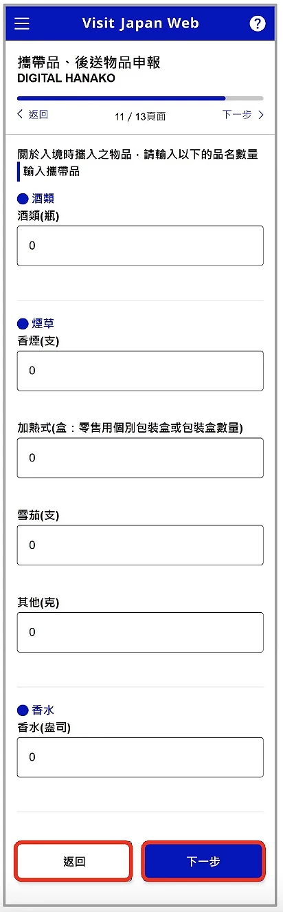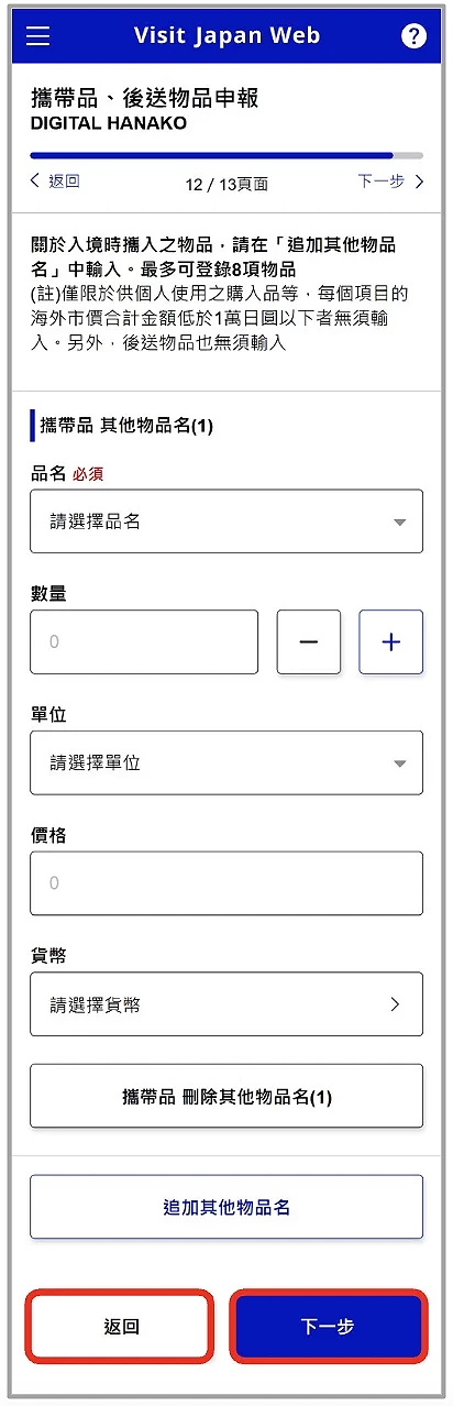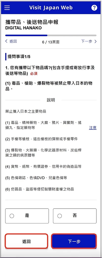 然後在確認完外國人入境記錄的資料都無誤後,就需要填寫海關部分的提問事項,問題包括了「您是否有被日本國強制性的遣送離境、被命令出國、或被拒絕入境之事」、「您以前在日本或其他國家是否有觸犯刑法並被判處有罪的經歷」等問題(圖6-5),請依實際情況選擇是或否,並確認再前往下一步。接著你可以選擇會否替同行家人一併申報,此處如選擇「是」,同行家人將不用再填寫申報資料,若該名同行家人之前已登錄的申報資料也將被現正登錄中的版本覆蓋。再來需要回答「攜帶品、後送物品申報」的提問事項(圖6-6),下一頁就需要填攜帶品種類的數量(圖6-7)和其詳細資料(圖6-8)。如果不清楚後送物品的數量,輸入「 0 」即可。