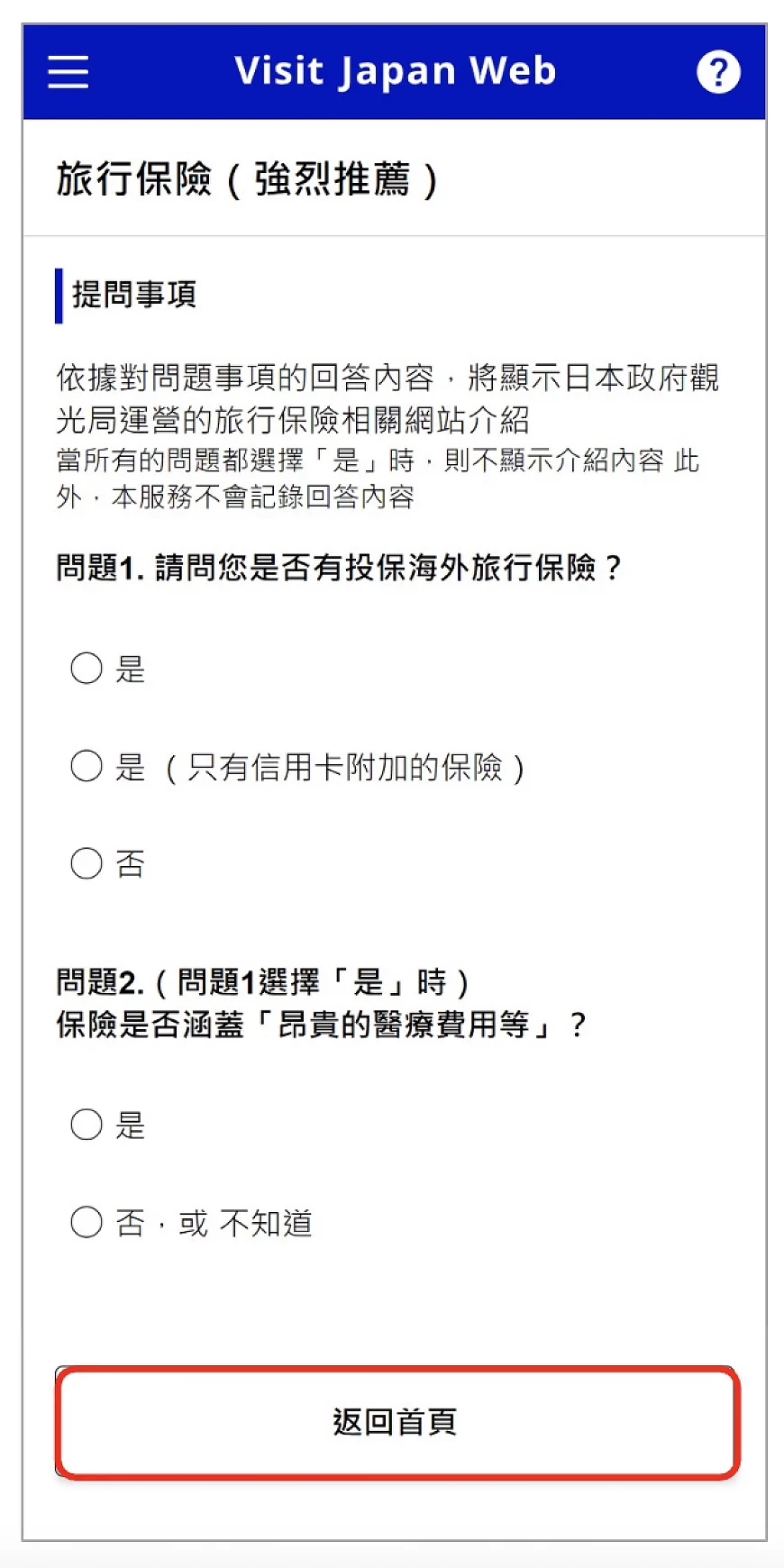 有試過入境的時候才發現還沒有買旅行保險嗎?試過的話那這個功能你可能要學會了!在首頁畫面點「投保海外旅行保險」(圖8-1)便會進入相關畫面,如果你已經買了保險的話就不需要這個服務,點返回首頁即可(圖8-2)。而需要買旅行保險的話只要回答相關的提問事項,包括點選「無海外旅行保險的介紹內容」(圖8-3),之後就會轉跳到最尾(圖8-4)日本政府觀光局運營的旅行保險相關網站的介紹內容了,當然純粹想要參考日本旅行保險介紹的話也可以善用這個功能喔。
