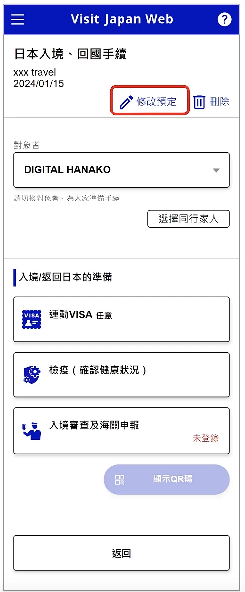 進入入境、回國預定的填寫畫面(圖3-5)後系統會要求你輸入行程的名稱,但並非必填,故想不到名目的話,可以跳過。注意將「抵達日本預定日」、「航空公司名稱」、「航班號」三個必填的訊息都填好就可以了。接著需要輸入在日本的聯絡處地址(預設值會顯示於步驟 2 登錄入境、回國預定中填寫的「在日本的聯絡處」)。下一步就是登錄同行家人,系統會顯示出此前填寫過的同行家人資料,在此只要勾選該當的同行家人就能登錄,無需再次填寫名字(圖3-6)。確認畫面中可以一次看到本旅程的資料,確認無誤之後按下「登陸預定」就可以保存資料(圖3-7)。如果之後想要修改或刪除預定資料,點選右上角的鉛筆圖案即可編輯資料;刪除則可點選垃圾桶圖案(圖3-8)。