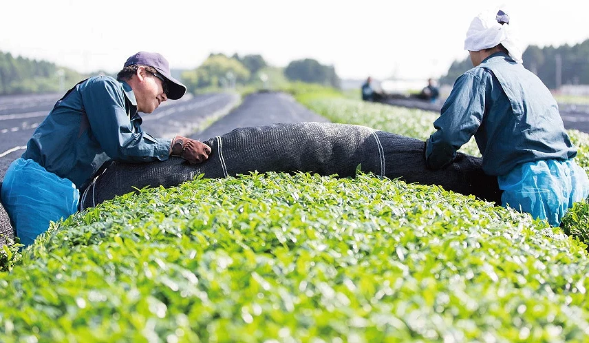 新芽萌發的4月中旬開始用布幕覆蓋茶園