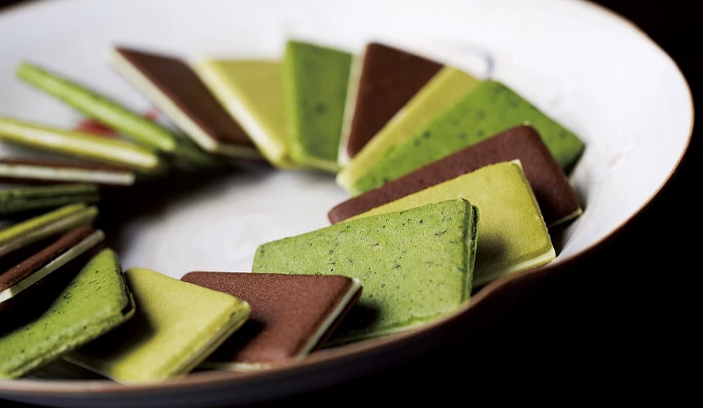 「茶賓」是辻利兵衛本店的特色綜合伴手禮。內含抹茶、焙茶和玄米茶三種口味的餅乾,中間夾著香濃白巧克力能,夠滿足一次品味三種日本特色茶的願望。這款餅乾的外型沉穩,帶有日本茶的意象,每一種口味都展現了獨特茶香,非常適合搭配手刷抹茶一起品嚐。