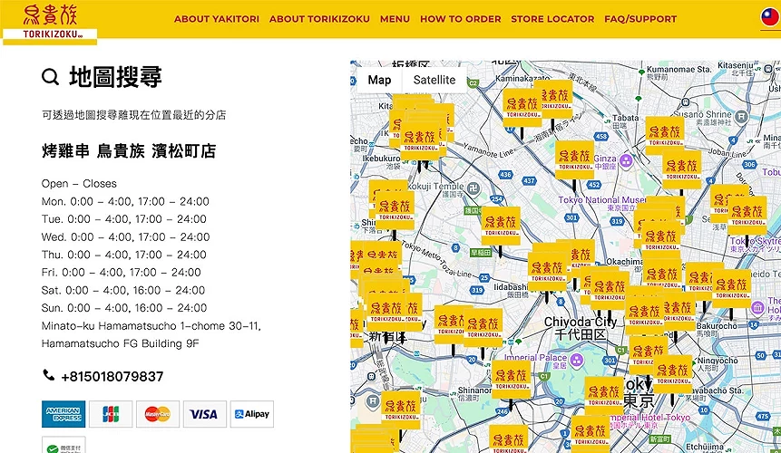 在鳥貴族的中文網站上,可直接按地區或使用地圖搜尋功能,尋找最近的分店位置,並直接進行線上訂位,各分店營業時間、支付方式也一目瞭然,非常簡單好懂。