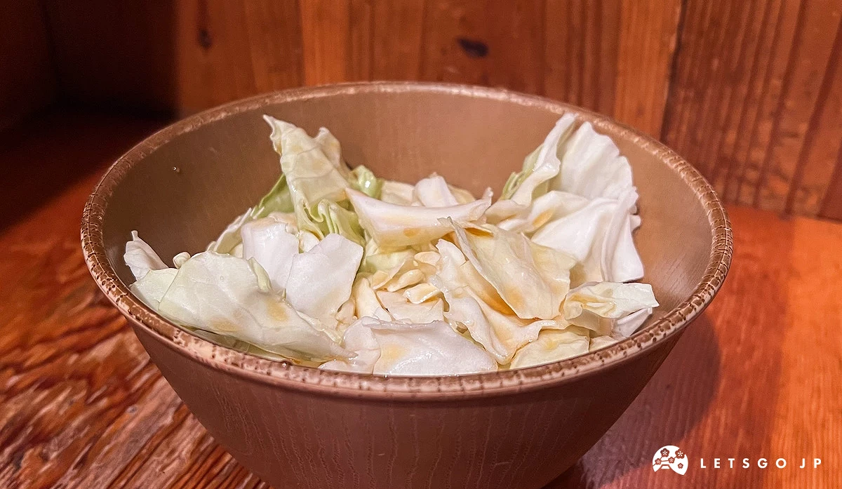 來鳥貴族一定會點的還有「高麗菜盤」,爽脆的高麗菜淋上清爽的醬汁,與醬汁串燒一起吃非常搭,也可以解膩,最重要的是高麗菜可以免費無限續,許多常客一入座就會先點上一盤,邊聊天邊配串燒。