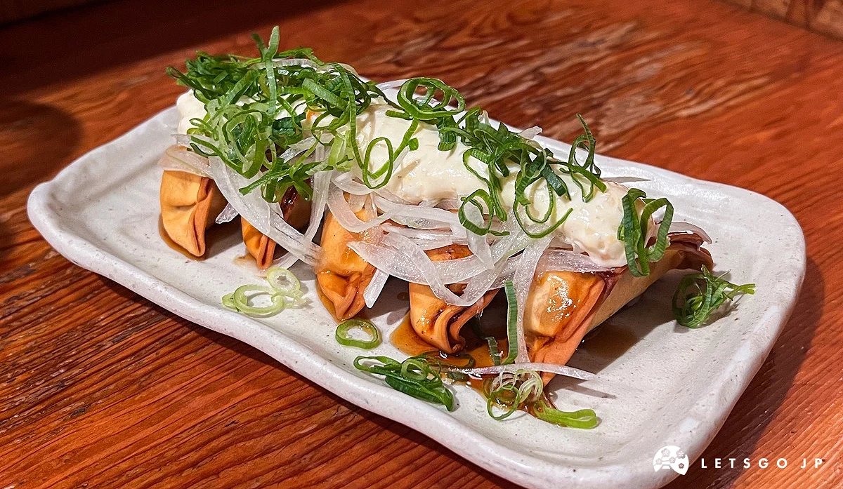 現炸的餃子內餡是帶有酸味及微辣的泡菜,外皮炸得香脆但不油膩,上面擠上塔塔醬跟甜醋,再灑上蔥花,做法新穎,口感層次豐富,吃起來特別過癮,也很適合配啤酒。