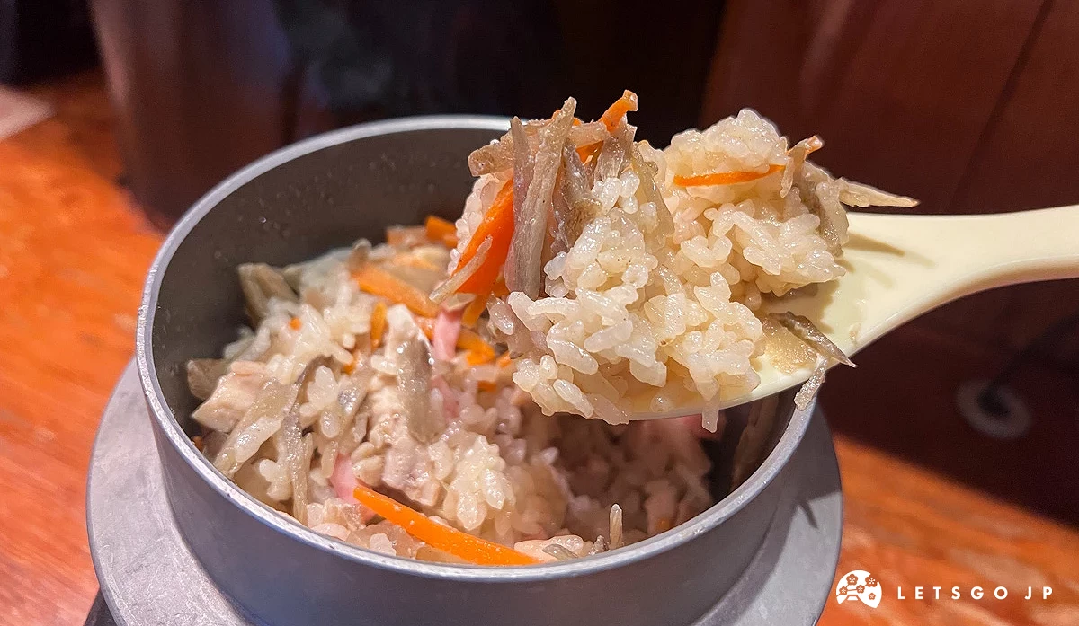 內行人一定會點的就是「貴族雞湯釜飯」,店員把小鍋送到桌上,用上雞骨湯頭現煮,配料有雞肉、紅蘿蔔、牛蒡等非常足料,大概等30分鐘就可以吃了!飯粒吸飽雞湯精華,適合兩個人以上分享。因為完成需時,建議一入座就要點!