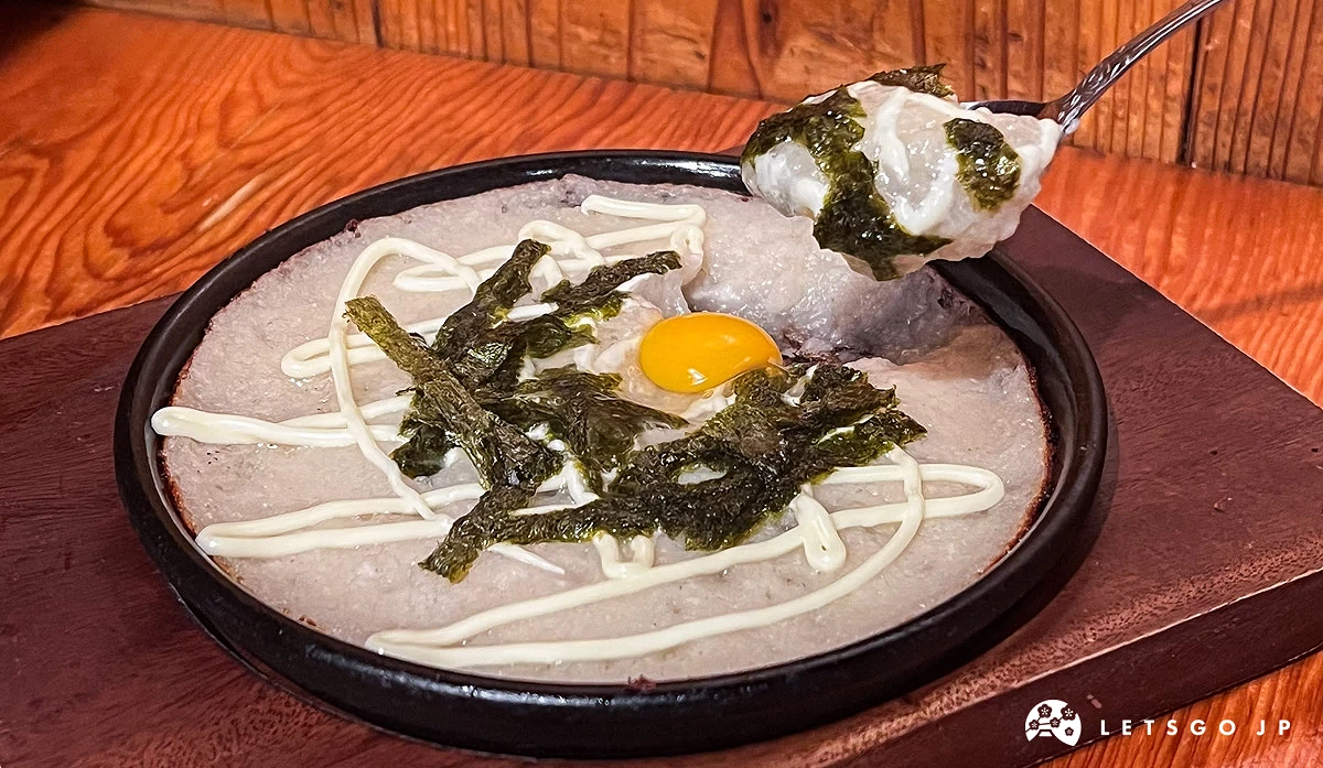 以圓形小鐵板盛載、熱騰騰的「山藥泥鐵板燒」,用上日本國產的山藥及特製高湯調味,以小湯匙舀來吃,口感綿密,像較清爽的馬鈴薯泥,加上海苔、鵪鶉蛋黃、美乃滋,層次豐富又有飽足感。