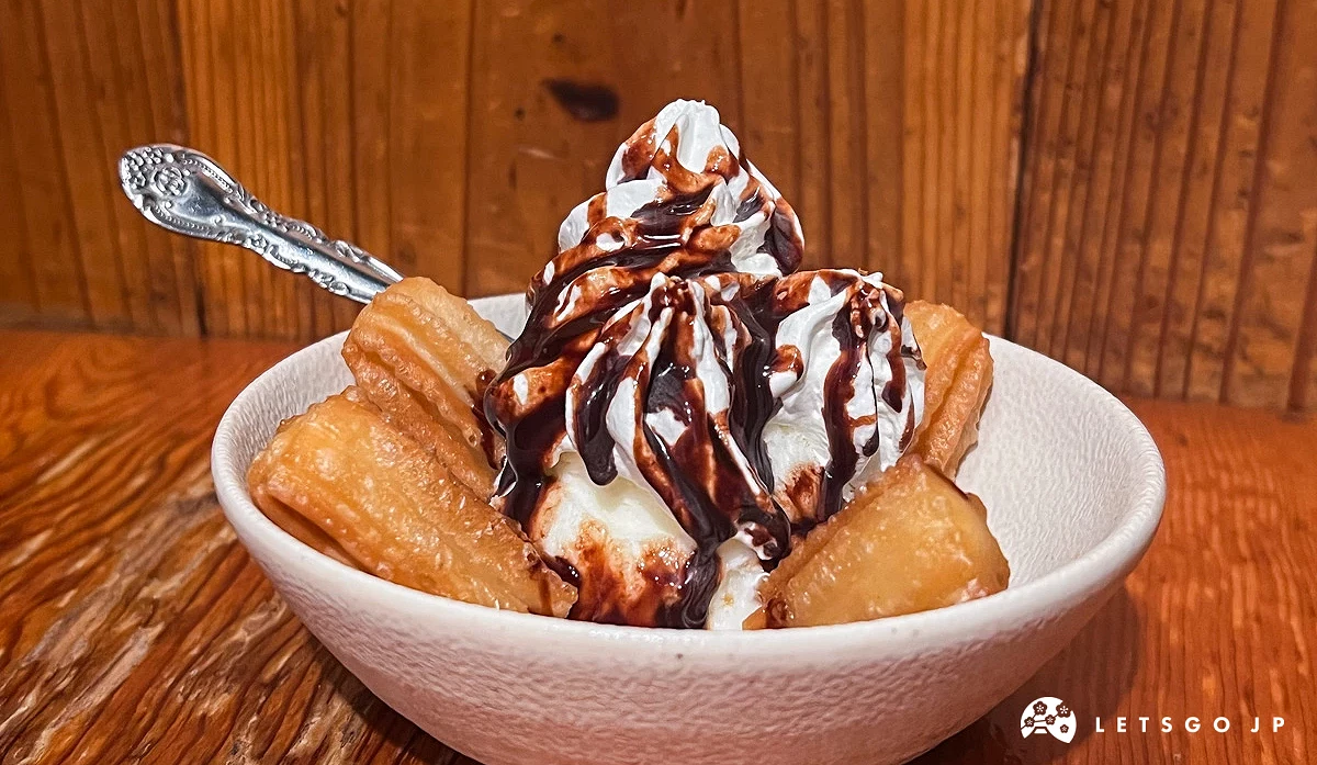 鳥貴族的甜點也是人氣之選,巧克力百匯選用來自京都北部「平林乳業」所生產牛奶製作的霜淇淋,奶味濃厚可口,配上現炸的吉拿棒,淋上巧克力醬跟生奶油,用蘸的方式或是用小湯匙吃同樣滿足。
