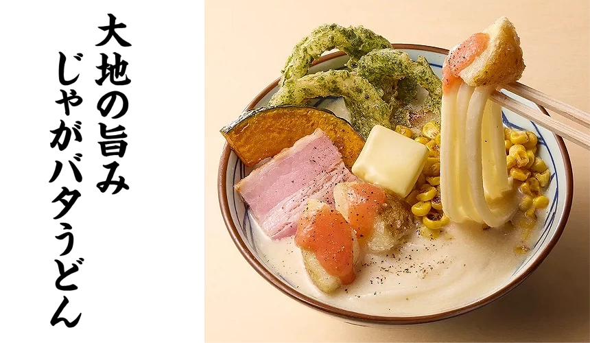 使用北海道代表品種「北あかり」馬鈴薯製作,搭配濃郁豆乳湯頭與明太子奶油,呈現出滿滿「大地的鮮味」。柔滑的豆乳高湯中融入奶油香氣,並加入洋蔥海苔天婦羅、炸南瓜天與明太馬鈴薯天,配料豐富、層次多變。將剛打好的烏龍麵拌入融化的奶油中,每一口都能感受到北海道食材的濃厚旨味,是冬季限定的人氣創意口味。