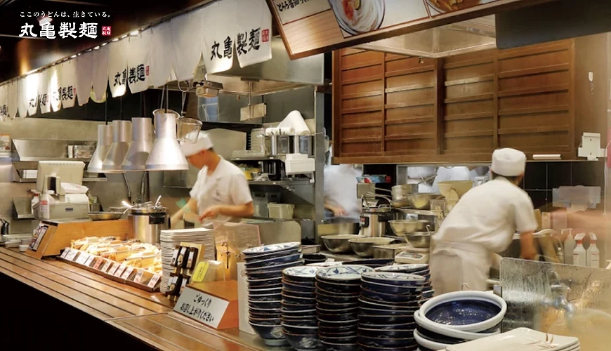 丸龜製麵是日本最具代表性的烏龍麵連鎖品牌,全國47個都道府縣皆有分店,門市數量約870家(2025年上半期),是名副其實的日本最大規模烏龍麵連鎖店。店內最大特色是以「現打、現煮、現拌」的方式呈現職人風味,麵條每日在店內手工製作,Q 彈滑順、香氣十足。採自助式點餐方式,能自由搭配天婦羅、小菜,以親民價格與高品質口感深受歡迎,讓旅客輕鬆體驗日本人日常的平價美食。