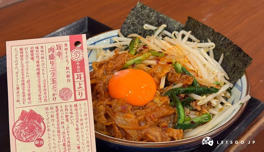 這次期間限定登場的「香辣肉盛韭菜蛋烏龍麵(旨辛 肉盛りニラ玉ぶっかけうどん)」,以香氣濃郁的豬肉洋蔥炒肉與特製辣味醬汁為主角,搭配現炸韭菜與豆芽、滑嫩蛋黃、海苔與蒜香配料,整碗豪邁又香氣四溢。以韓式辣醬與豆瓣醬拌炒出的肉香,與 Q 彈手打烏龍麵緊密融合,層層堆疊出鮮香與辣味的完美平衡。無論是直接品嚐,或將配料與麵條充分攪拌後豪邁入口,都能感受到丸龜製麵期間限定的滿滿誠意與魄力。