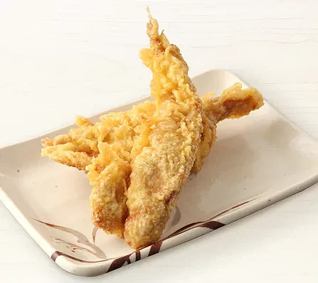 丸龜製麵天婦羅炸物架上最受歡迎的王者「炸雞胸肉天婦羅(かしわ天)」,以特製醬汁醃漬雞胸肉後低溫油炸,外皮金黃酥脆、內裡仍保有肉汁與嫩度,完美呈現「外酥內嫩」的口感。這道料理承襲自丸龜創業初期的「燒鳥職人技法」,可說是從居酒屋文化中誕生的「讚岐風炸雞」。無論搭配烏龍湯麵或冷麵都十分合拍,也推薦單吃或沾上少許天婦羅醬品嚐,感受雞肉鮮香與炸衣香氣交織的極致美味。
