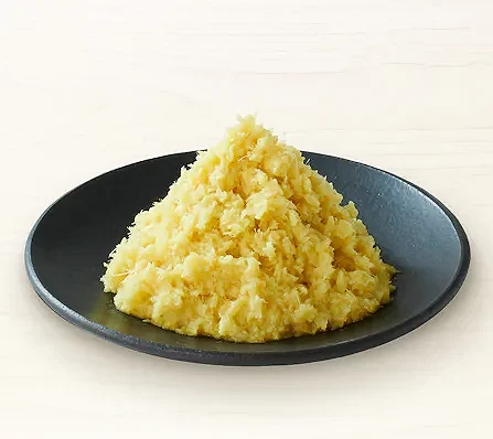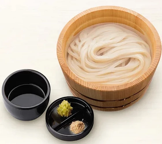 「釜揚烏龍麵」是丸龜製麵的代表招牌,使用100%日本國產小麥現場手打自製的烏龍麵為基礎,剛從大鍋中煮起,不經冷水冰鎮,直接放入木桶中上桌。這樣的製法能完整保留麵體的柔韌與彈性,口感宛如白玉般 Q 滑,散發淡淡小麥香。微微粗糙的麵身更能吸附濃郁的醬汁,一口下去,暖心又滿足。建議可沾上特製柴魚高湯與醬油調製的「釜揚湯汁」,感受最純粹的讚岐風味。