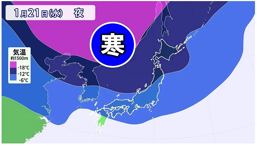 根據氣象廳預測,從 1 月 20 日、21 日左右開始,日本將受到今冬之中較為強烈的寒氣影響。這段期間正值二十四節氣之一的「大寒」,本來就是一年之中平均氣溫最低的時期,在寒氣南下疊加之下,各地實際體感溫度將更加嚴酷。