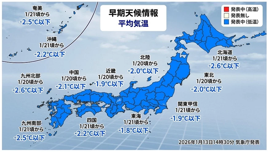 此次低溫早期天氣資訊的對象涵蓋北海道至沖繩的全日本所有地區。「相當程度低溫」的基準為氣溫比平年低 2 度以上,部分地區甚至可能降至平年差約 −2.5 度。氣象單位提醒,需留意農作物凍害、自來水管結冰,以及用電需求增加所帶來的影響。