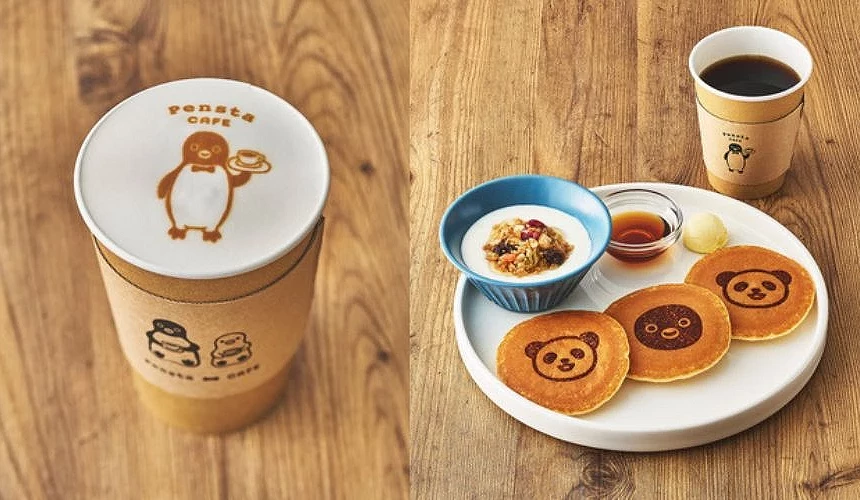 「Pensta ecute 上野」店內特設咖啡區,從牆面、杯盤到餐點都能看見 Suica 企鵝的身影。鬆餅更是印上 Suica 企鵝與上野名物熊貓的呆萌正臉,一上桌就讓人忍不住拍照打卡。另外為方便通勤族,咖啡區早上6:30便開始營業;若一早就要搭車,推薦來外帶一杯企鵝拉花拿鐵提神,讓可愛的企鵝陪你開啟充滿元氣的一天!