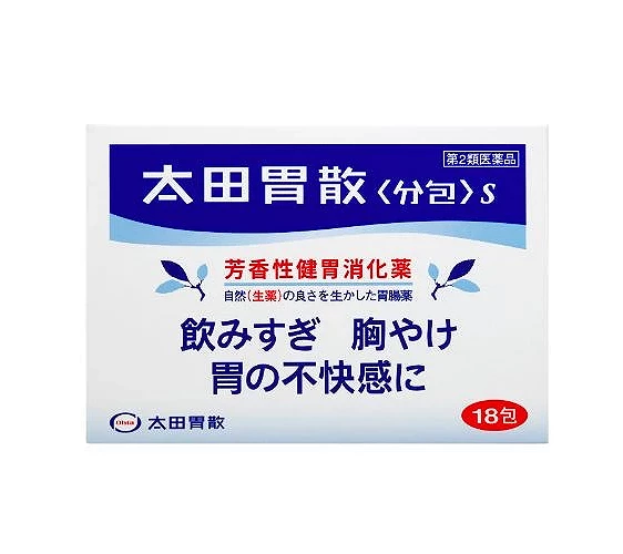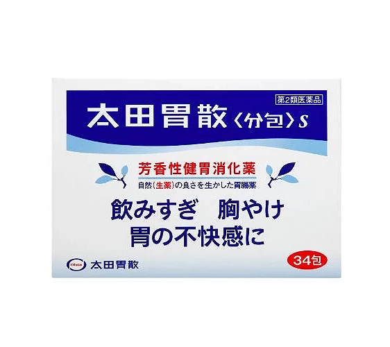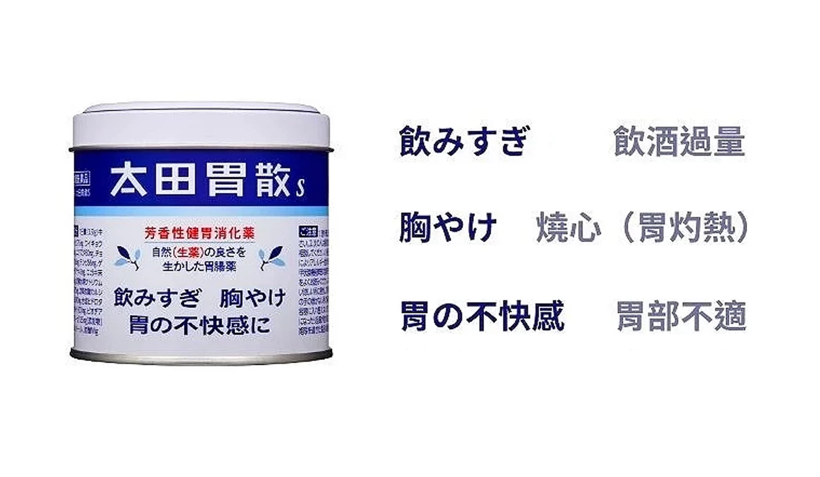 日常生活中常見的胃部不適情形皆可使用「太田胃散 S」,其包裝上標示針對「飲酒過量(飲みすぎ)」、「胃灼熱(胸やけ)」、「胃部不適(胃の不快感)」等症狀有效。
