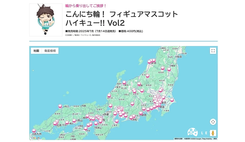 日本最大扭蛋品牌之一「Gashapon」,打開官網點右上角「搜尋」鍵,輸入扭蛋的「日文關鍵字」,就會出現該款主題的各種扭蛋。點選你要找的扭蛋,下面就會出現全日本店鋪地圖,有記號的店家就能找得到喔!