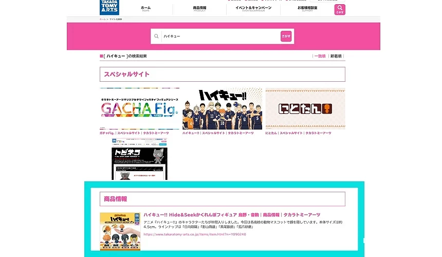 ① 右上角「搜尋」扭蛋角色關鍵字,下面出現「商品情報」圖片來源:Takara Tomy Arts 官網