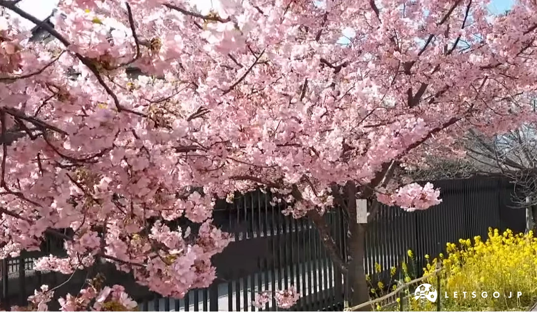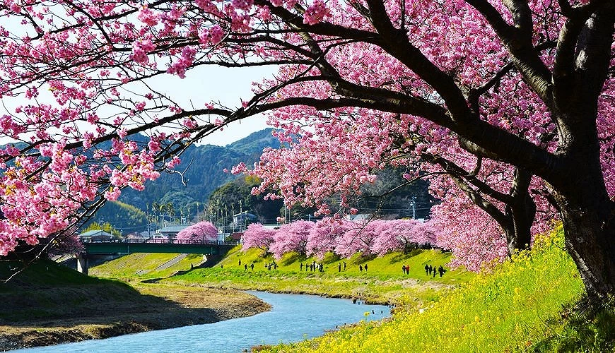說到河津櫻,首先想到的絕對是伊豆半島河津町吧!沿著河津川兩岸綿延約4公里,種植超過800棵河津櫻,盛開時形成連續的粉紅隧道,視覺效果相當震撼。河岸同時還有黃色油菜花盛開,黃黃粉粉色彩對比鮮明,是日本早春賞櫻的經典畫面。最佳觀賞期大多落在2月中下旬,期間也會舉辦河津櫻花祭,邊賞花邊逛攤位,熱鬧又在地的季節氛圍超棒!
