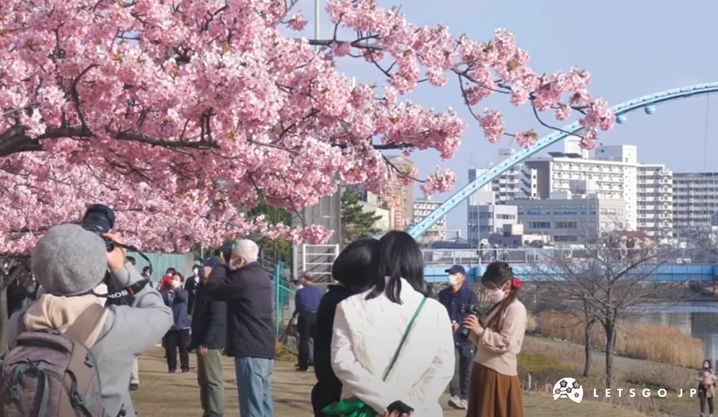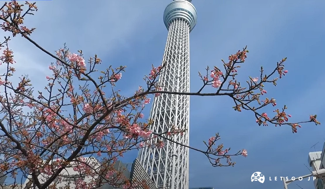 東京晴空塔周邊最知名的河津櫻拍攝點位於「東武橋」一帶,雖然櫻花數量不多,但因地理位置極佳,成為少數能近距離拍到「櫻花襯托完整晴空塔」的熱門地點。這裡的河津櫻通常於2月下旬開始綻放,花期可延續至3月初,粉紅花色與藍天、高塔構成鮮明對比,畫面辨識度極高。周邊結合商場、展望台與餐飲設施,早春時節邊賞櫻邊觀光也沒問題。