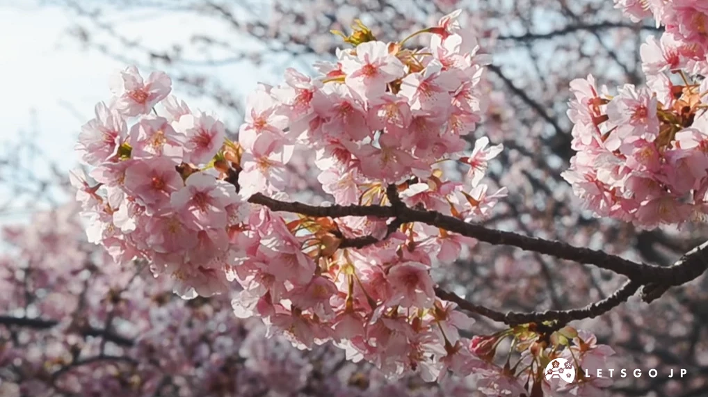 「河津櫻」是在日本自然環境中誕生的園藝櫻花品種,並非人工刻意培育,親本是大島櫻與寒緋櫻,因此同時具備花型柔和與花色濃郁的特徵。河津櫻近年逐漸在關東與關西地區被廣泛種植,開花時間早於染井吉野櫻,花朵整體綻放時間也比較長,因此很適合想避開賞櫻人潮,又希望看到盛開櫻景的遊客。