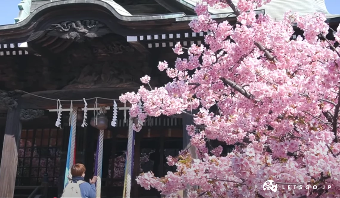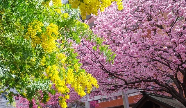 「藏前神社」位於台東區藏前,每到早春,河津櫻與金合歡同時綻放,粉嫩櫻花與金黃色花球交錯,搭配周邊草木的綠意,形成層次豐富的多色早春景色。神社周邊交通方便,鄰近淺草,也有不少特色咖啡館與選物小店,賞花之餘可順道享受慢步調的東京下町氛圍,非常適合安排一日散步賞花行程。