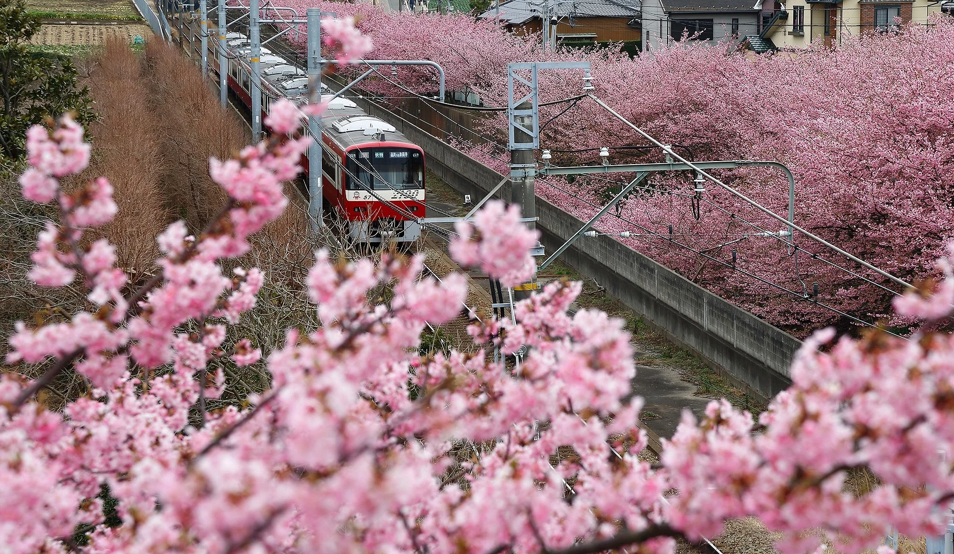 「三浦海岸」的河津櫻位於神奈川縣三浦市,每年2月中旬到3月上旬盛開,期間也會舉辦「三浦海岸櫻花祭」,河津櫻從「三浦海岸站」前一路延伸,可以拍到粉嫩櫻花與筆直鐵道、藍色海景同框。這裡的特色在於櫻花密集、步行路線平坦,不論是賞花散步或拍照都相當舒服,加上距離東京近,非常適合安排成一日小旅行的賞櫻景點。